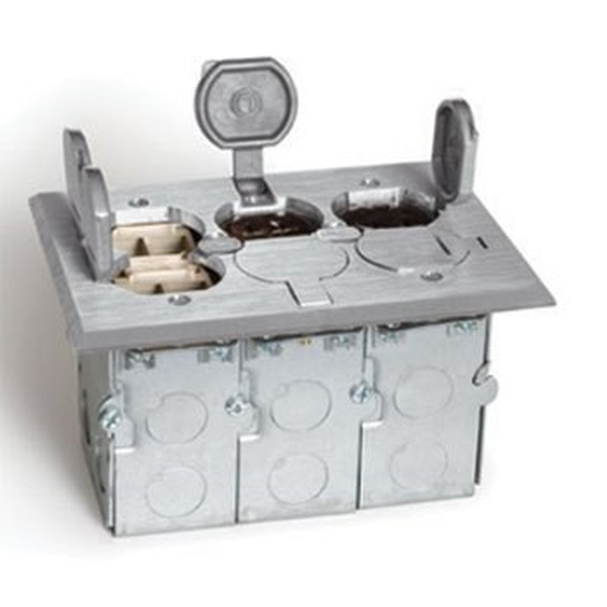 The Lew Electric SWB-6-LR-A is a rectangular floor box that holds (6) 15A tamper resistant power outlets, the top aluminum plate features six flip lids. The box meets NEMA WD1-1983 heavy duty requirement for display receptacles, the box and outlets are UL listed. The box features a water tight assembly and includes a neoprene gasket. The box is adjustable and can accommodate any thickness floor up to 3/4".