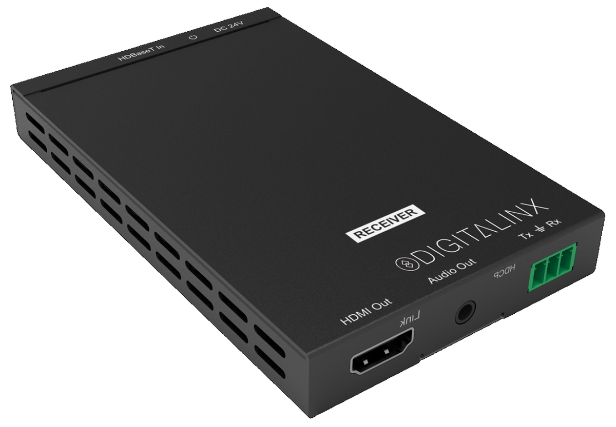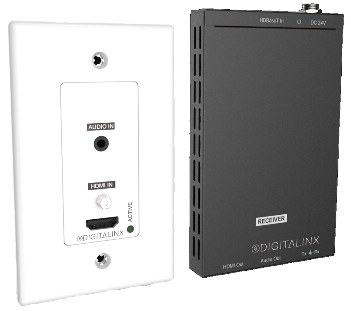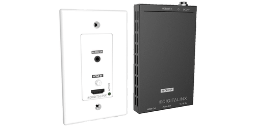 The Digitalinx DL-1H1A-WPKT-W HDBaseT extender set transmits HDMI, audio and RS232 over single category 6 twisted pair cable. The DL-1H1A-WPKT-W can transmit 4K resolutions up to 4K@60Hz, 4:2:0 up to 40m / 120’ and 1080P up to 70m / 230’. The audio circuit is completely separate and is not dependent on the HDMI input source to be active. The Digitalinx DL-1H1A-WPKT-W is HDCP 2.2 compliant. The DL-1H1A-WPKT-W HDBaseT receiver powers wall plate transmitter via HDBaseT so there is no need for an external power supply for the wall plate.