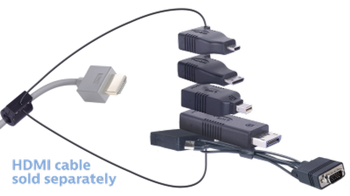 The Liberty AV DL-AR-VGA is a Multi-Format to HDMI adapter ring which can be used for VGA to HDMI connection, it locks on to the end of your existing HDMI cable and provides 5 adapters conveniently located and easy to use. Your adapters can no longer be lost or stolen, the high strength steel cable securely attaches to your HDMI cable so your adapters are always ready to use. Just grab the adapter from the ring you need and plug into your HDMI cable, it is easy as that. There is no signal loss using any of the adapters, your picture quality will remain the same. Perfect for your presentations, the DL-AR-VGA has every video format covered. The adapters are sleek and take up little space, they are all plug and play with no software required. The security clamp attaches to any HDMI cable ranging from micro 4mm thick to large 11mm thick HDMI cables. Use a Torx T10 screw driver (not included) to attach the ring to the HDMI cable, if you need this please purchase part number T10PD. The VGA to HDMI adapter has a USB connection on it that typically needs to be plugged into your laptop to achieve full 1080P video, on a Windows PC it will also pass audio.