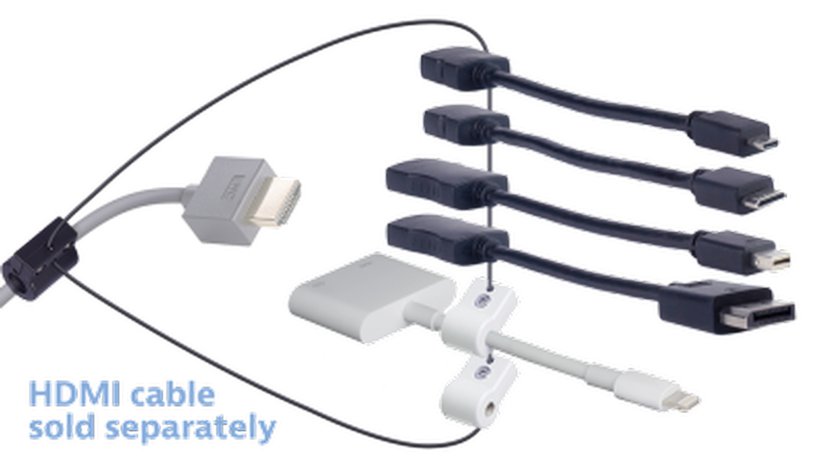 The Liberty AV Solutions DL-AR1198 adapter ring kit is a multiple format to HDMI adapter ring that locks on to the end of your existing HDMI cable and provides all your adapters on a conveniently located, easy to use, ring. Your adapters can no longer be lost or stolen, with the high strength steel cable, your adapters are securely attached to your HDMI cable, making them available for use when needed. To use, simply choose the adapter you need from the ring, attach it to your device and plug into your HDMI cable, it is that easy. There is no signal loss using any of the adapters, your picture quality will remain the same. Perfect for your presentations and adapting mobile content to an HDMI infrastructure, the DL-AR1198 gives you coverage for the exact video format you need and solves your issues of trying to find the right cable or adapter.