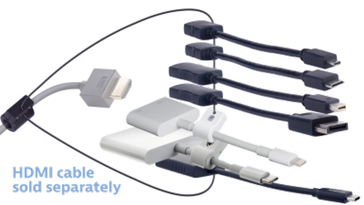 The Liberty AV Solutions DL-AR2793 adapter ring kit is a multiple format to HDMI adapter ring that locks on to the end of your existing HDMI cable and provides all your adapters on a conveniently located, easy to use, ring. Your adapters can no longer be lost or stolen, with the high strength steel cable, your adapters are securely attached to your HDMI cable, making them available for use when needed. To use, simply choose the adapter you need from the ring, attach it to your device and plug into your HDMI cable, it is that easy. There is no signal loss using any of the adapters, your picture quality will remain the same. Perfect for your presentations and adapting mobile content to an HDMI infrastructure, the DL-AR2793 gives you coverage for the exact video format you need and solves your issues of trying to find the right cable or adapter.