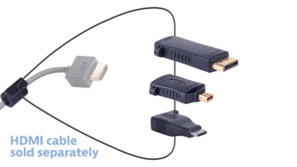 The Liberty AV Solutions DL-AR3958 adapter ring kit is a multiple format to HDMI adapter ring that locks on to the end of your existing HDMI cable and provides all your adapters on a conveniently located, easy to use, ring. Your adapters can no longer be lost or stolen, with the high strength steel cable, your adapters are securely attached to your HDMI cable, making them available for use when needed. To use, simply choose the adapter you need from the ring, attach it to your device and plug into your HDMI cable, it is that easy. There is no signal loss using any of the adapters, your picture quality will remain the same. Perfect for your presentations and adapting mobile content to an HDMI infrastructure, the DL-AR3958 gives you coverage for the exact video format you need and solves your issues of trying to find the right cable or adapter.