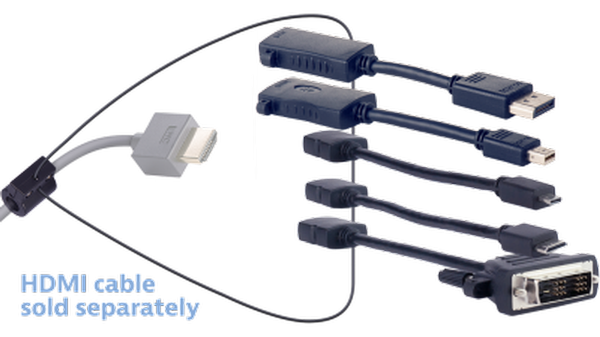 The Liberty AV Solutions DL-AR4731 adapter ring kit is a multiple format to HDMI adapter ring that locks on to the end of your existing HDMI cable and provides all your adapters on a conveniently located, easy to use, ring. Your adapters can no longer be lost or stolen, with the high strength steel cable, your adapters are securely attached to your HDMI cable, making them available for use when needed. To use, simply choose the adapter you need from the ring, attach it to your device and plug into your HDMI cable, it is that easy. There is no signal loss using any of the adapters, your picture quality will remain the same. Perfect for your presentations and adapting mobile content to an HDMI infrastructure, the DL-AR4731 gives you coverage for the exact video format you need and solves your issues of trying to find the right cable or adapter.