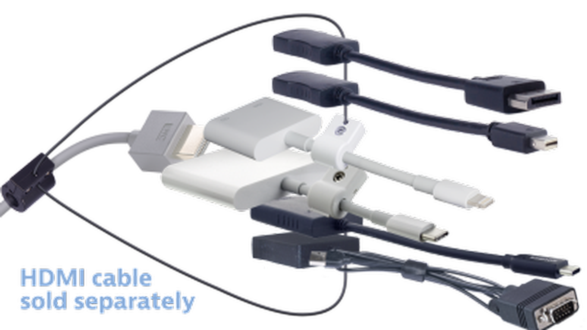 The Liberty AV Solutions DL-AR4830 adapter ring kit is a multiple format to HDMI adapter ring that locks on to the end of your existing HDMI cable and provides all your adapters on a conveniently located, easy to use, ring. Your adapters can no longer be lost or stolen, with the high strength steel cable, your adapters are securely attached to your HDMI cable, making them available for use when needed. To use, simply choose the adapter you need from the ring, attach it to your device and plug into your HDMI cable, it is that easy. There is no signal loss using any of the adapters, your picture quality will remain the same. Perfect for your presentations and adapting mobile content to an HDMI infrastructure, the DL-AR4830 gives you coverage for the exact video format you need and solves your issues of trying to find the right cable or adapter.