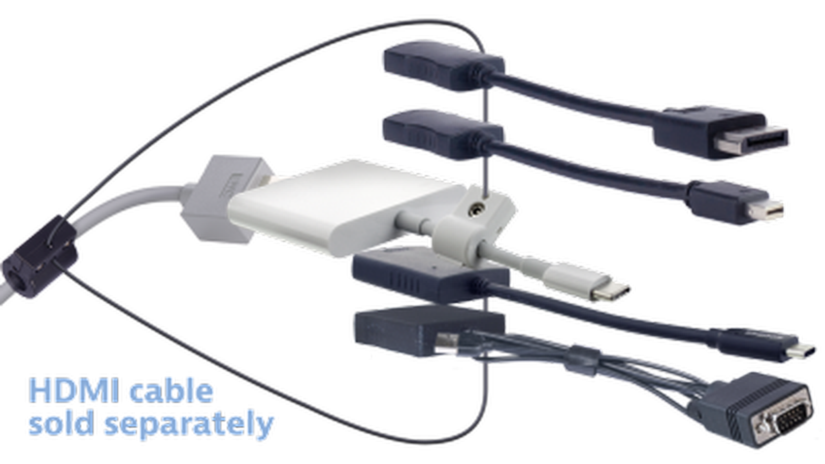 The Liberty AV Solutions DL-AR5147 adapter ring kit is a multiple format to HDMI adapter ring that locks on to the end of your existing HDMI cable and provides all your adapters on a conveniently located, easy to use, ring. Your adapters can no longer be lost or stolen, with the high strength steel cable, your adapters are securely attached to your HDMI cable, making them available for use when needed. To use, simply choose the adapter you need from the ring, attach it to your device and plug into your HDMI cable, it is that easy. There is no signal loss using any of the adapters, your picture quality will remain the same. Perfect for your presentations and adapting mobile content to an HDMI infrastructure, the DL-AR5147 gives you coverage for the exact video format you need and solves your issues of trying to find the right cable or adapter.