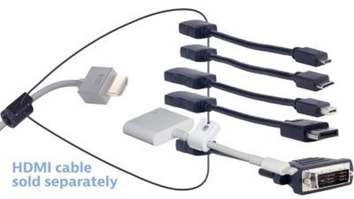 The Liberty AV DL-AR627 is an HDMI to many format adapter ring, it locks on to the end of your existing HDMI cable and provides six 5.5" adapters conveniently located and easy to use. Your adapters can no longer be lost or stolen, the high strength steel cable securely attaches to your HDMI cable so your adapters are always ready to use. Just grap the adapter from the ring you need and plug into your HDMI cable, it is easy as that. There is no signal loss using any of the adapters, your picture quality will remain the same. Perfect for your presentations, the DL-AR627 has your digital video formats covered as well as Apple Lightning.