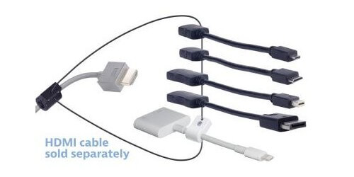 The Liberty AV DL-AR663 is an HDMI to many format adapter ring, it locks on to your existing HDMI cable and provides five 5.5" adapters conveniently located and easy to use. Your adapters can no longer be lost or stolen, the high strength steel cable securely attaches to your HDMI cable so your adapters are always ready to use. Perfect for your presentations the DL-AR663 has every format covered. The cables feature sleek adapters and gold plated connectors for the most reliable connection possible.