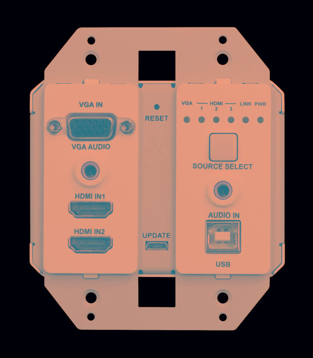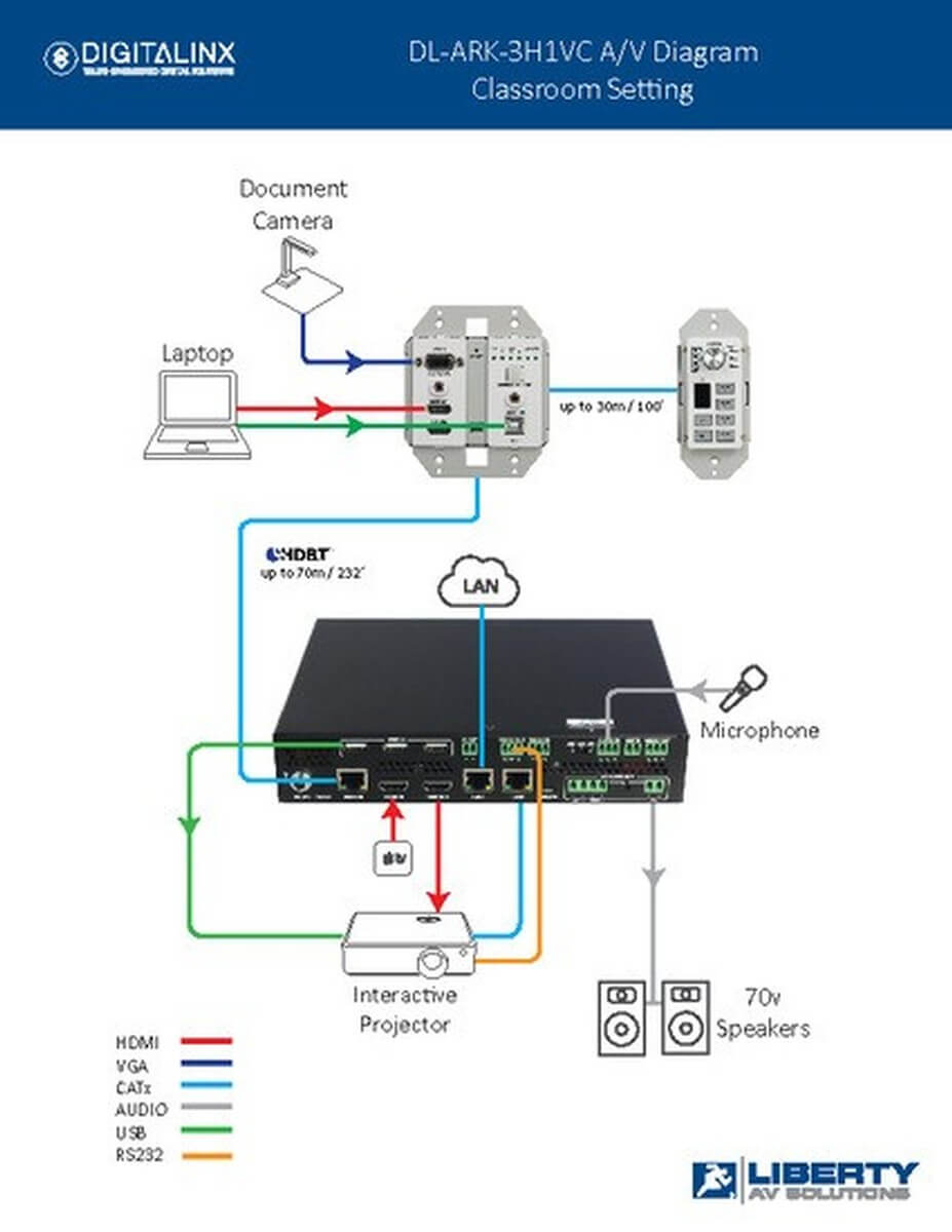 There are two systems available in the series; the DL-ARK-3H1VC features 2 HDMI inputs and 1 VGA with audio input on the wall plate transmitter and the DL-ARK-4HC features 3 HDMI inputs on the wall plate transmitter. Both HDBaseT transmitters features a USB B host port for connection to a computer or host and a dedicated audio input that is independent of all video inputs. The DL-ARK HDBaseT receiver for both systems provides an additional HDMI input for a local A/V input, an HDMI output for a display or projector, a 3 port client USB hub for connection to interactive white board or USB mic / camera, a two port LAN switch, mic / line analog audio input, line audio analog output, 40 watt 70 volt power amplifier output and an RS232 and IR output for display or projector control either by keypad controller or web server. The DL-ARK control keypad for both systems features audio and video input selection control for all A/V inputs, variable audio control for the mic/line input, line audio output and amplified audio output from the DL-ARK receiver and can control a connected display or projectors ON and OFF status via RS232 or IR from the receiver as well. The DL-ARK systems are UL Listed.