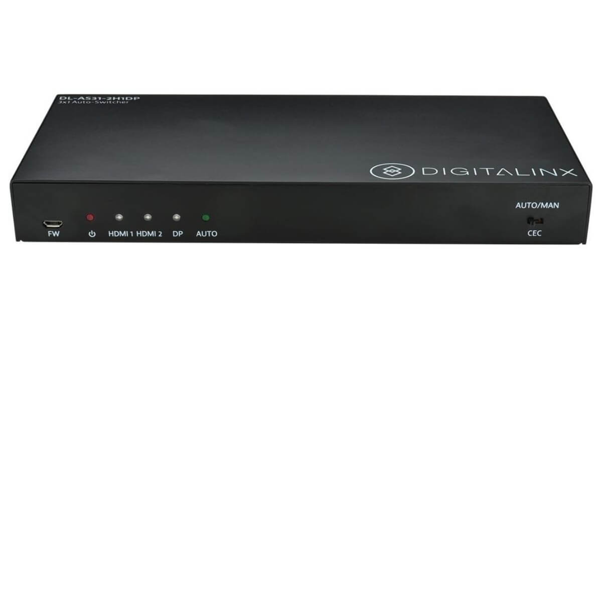 The DL-AS31-2H1DP is a multiformat auto-switcher with two HDMI inputs, one DisplayPort with analog audio input, one HDMI output, and one balanced analog audio output. This auto-switcher supports HDMI and DisplayPort video resolutions up to 4Kx2K at 30 Hz and multichannel audio. In addition to passing EDID information from the display, there are multiple built-in EDID settings to simplify an installation. The DL-AS31-2H1DP will de-embed the digital audio from the HDMI output signal, and output it via the balanced analog audio output port.