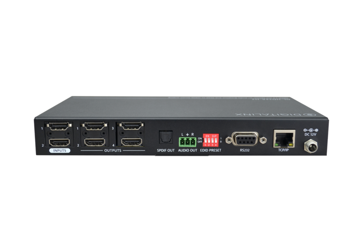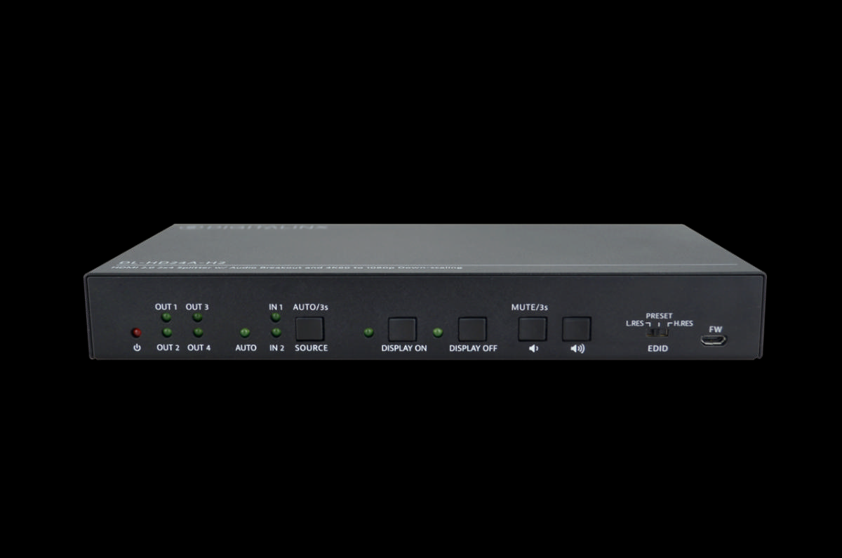 The Digitalinx DL-HD24A-H2 is an HDMI 2.0 compatible 2:4 auto scaling and auto switching HDMI distribution amp / splitter that features two HDMI inputs and four HDMI outputs. The splitters HDMI outputs can switch as a group to either input via auto or manual switching methods and supports down scaling so a 4K video input can automatically be down scaled to an 1080p output when connecting a display that only supports resolutions up to 1080p. The DL-HD24A-H2 supports 4K signals up to 4K@60Hz / 4:4:4 / 8 bit color and features an easy EDID management option using dip switches on the rear panel of the unit. Analog and digital audio can be de-embedded from the selected HDMI input and the DL-HD24A-H2 supports CEC control and is HDCP 2.2 compliant. The DL-HD24A-H2 can be controlled via front panel buttons, RS232 or by TCP/IP control.