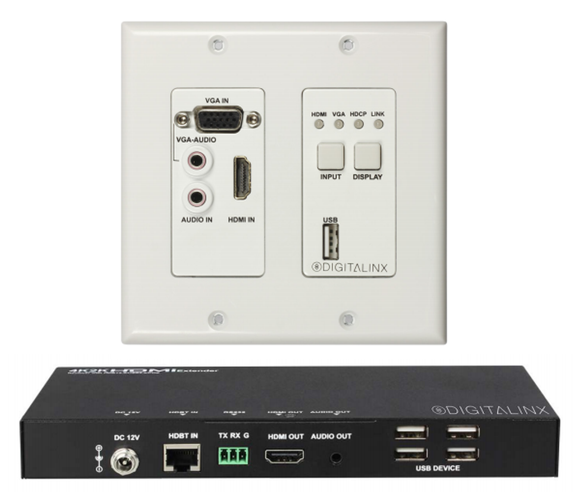Liberty introduces the ultimate auto-switching wall plate and receiver kit in the DL-HDBT2-WP-KIT. This kit includes the DL-1H1V1U-WP-W wall plate transmitter and the DL-HD2-RX receiver. Together, these products work to extend HDMI, VGA with audio, analog audio, and USB 2.0 up to a distance of 330 feet. They support 3K@60Hz 4:2:0 as well as HDCP 2.2 to ensure content protection. These devices are controllable with an RS232 controller.