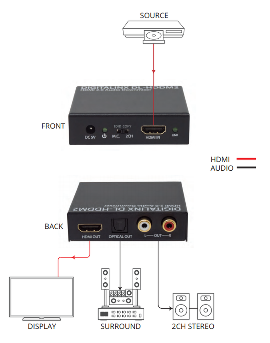 The DL-HDDM2 features an HDMI 2.0b compatible with audio support for up to six channel audio. The HDMI output passes the native multichannel audio signal through the HDMI output while sending multichannel audio through the optical digital audio output. The DL-HDDM2 also provides a 2-channel stereo down-mixed version to the L/R analog RCA outputs. Featuring three audio selection modes, you can choose the compatible audio format for the HDMI output as well as the Toslink and RCA audio outputs.
