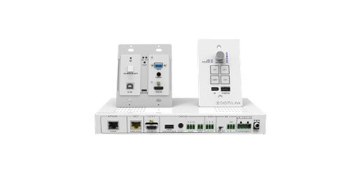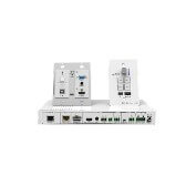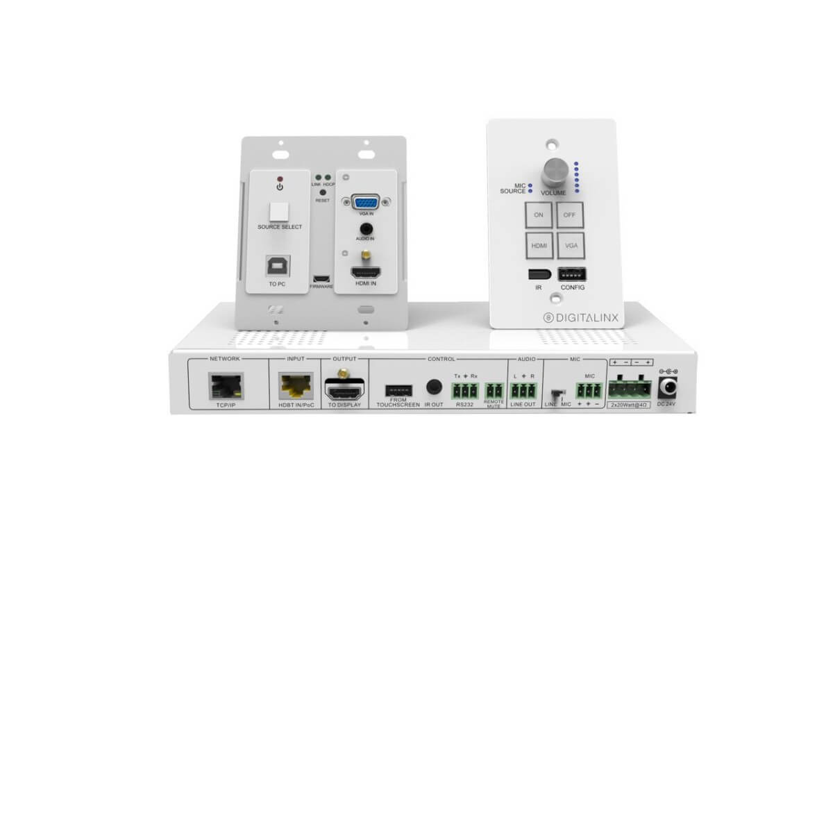Features and Benefits Includes wallplate transmitter, wallplate control panel Wallplate transmitter features: * VGA and HDMI inputs with automatic or manual switching * USB-B connection for local PC and interactive whiteboard * Single twisted pair for data and power Wallplate control panel features: * System on/off * Mic and source volume control * IR learning for controlling connected devices * Single twisted pair for data and power Receiver/processor features: * Mic/line input * HDMI output with audio de?embedding * IR and RS232 output for display and/or screen control * 2x20w 4 ohm amplifier for speaker integration * TCP/IP connectivity for system wide monitoring and * USB-A connection for local PC and interactive whiteboard * Hardware for ceiling or wall mounting Applications Extension of a VGA or HDMI source to one HDMI destination Small presentation space with audio reinforcement Ideal for training, education, and meeting installations