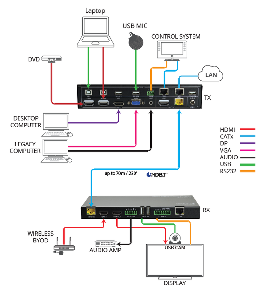 - Tx Inputs: 2x HDMI, 1x VGA w/audio, 1x Display Port, 4x USB 2.0