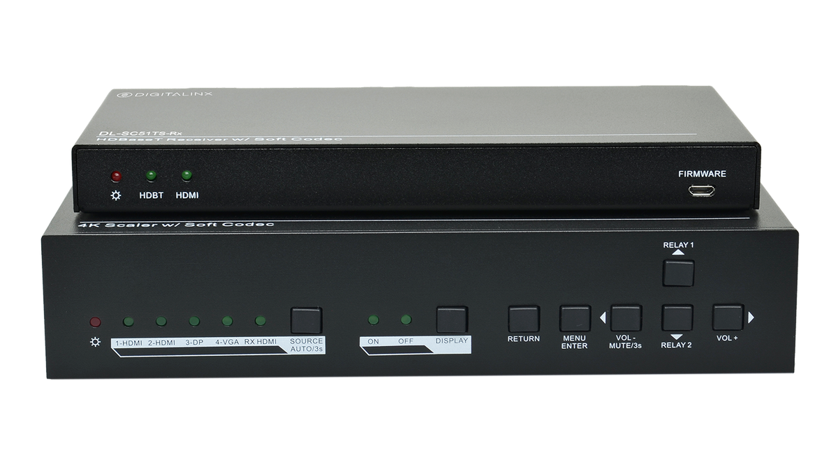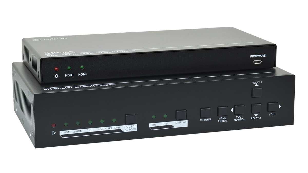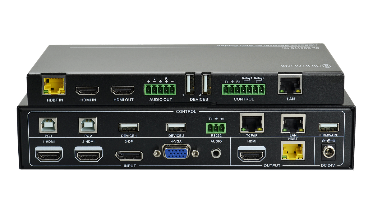 Introducing Liberty's Digitalinx DL-SC51TR 5x1 Two Piece Switcher with 4K compatibility and Softcodec Collaboration. This 5x1 auto switching extender has HDMI, DisplayPort, and VGA with 3.5 audio transmitter inputs and an HDMI input located on the receiver for BYOD products. Whenever a video signal is introduced to the system this device offers automated control, it also features an HDBaseT extension system that allows for long distance transmission (up to 230') of HDMI and software based VTC peripherals such as USB microphones and cameras.