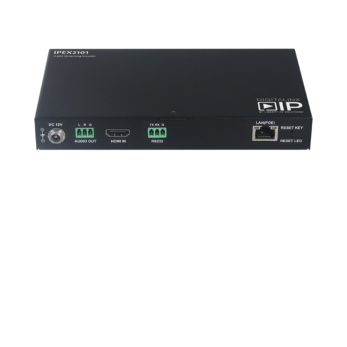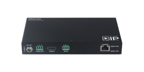 The DigitalinxIP IPEX2101 encodes / transmits HDMI video and audio over a 1Gb network infrastructure using h.264 AVC encoding with a configurable data rate up to 30 Mbps. The IPEX2101 supports video signals up to 1080p@60 Hz. An analog audio output port de-embeds 2 channel stereo audio from the embedded HDMI content.