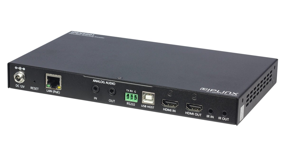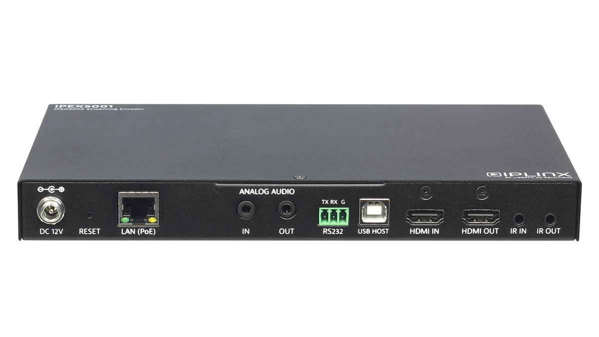 The IPEX5001 from Liberty AV is a HDMI over IP Encoder that supplies a scalable 4K solution over 1Gb network with full matrix & video wall capability. The IPEX5001 was designed to transmit HDMI video and audio over a gigabit IP netowkr using JPEG2000 encoding. It will support video signals up to 4K@60Hz 4:2:0 with HDCP 2.2 and 7.1 multi-channel audio. Using a 48 port gigabit switch, up to 45 encoders may be used to create an amazing matrix or switching system within a single installation. There is an analog audio input port which embeds the audio with the video content, such as a DVI video source. The IPEX5001 when used in conjunction with the IPEX5002 Decoder supports PoE (Power over Ethernet) and can equally be powered remotely by compatible power source equipment such as a PoE Ethernet switch, thus eliminating the need for a nearby power outlet, to help further the flexibility of this system. The RS-232 port relays commands from the IP controller and operates in a pass-through capacity to control a third part device such as a projector. The USB connection on this device will pass keyboard and mouse signals from the IPEX5002 decoder to the IPEX5001 encoder.