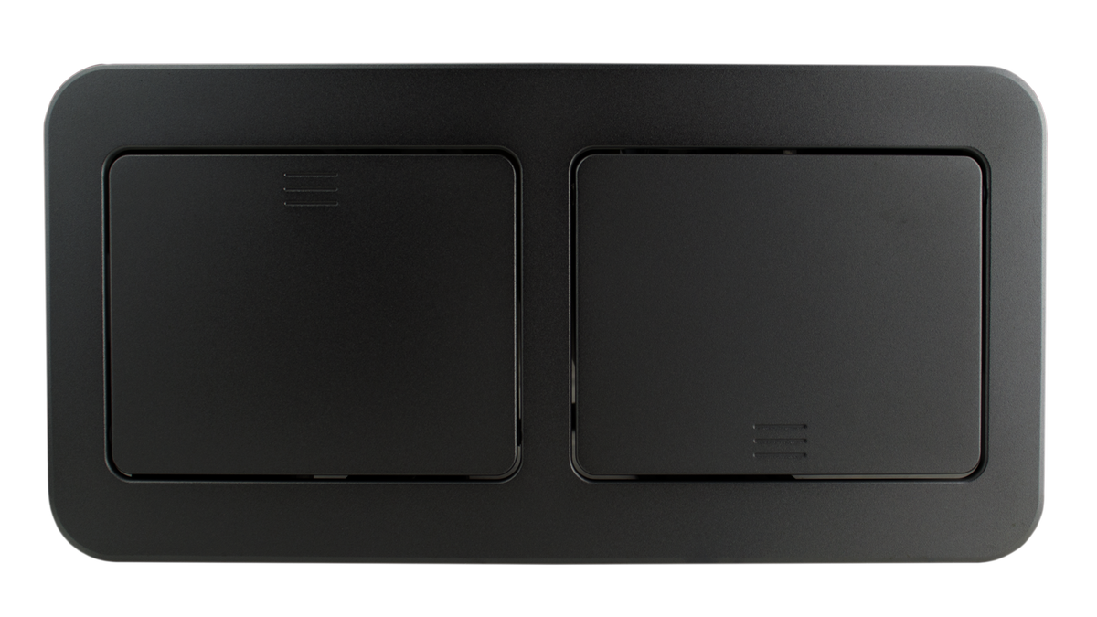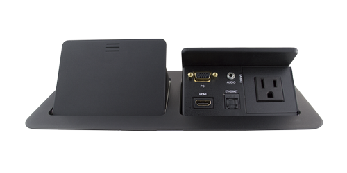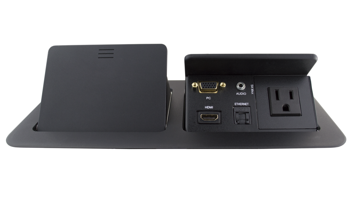The Liberty TDPB-2V1AD-B is a pop up style table box in black anodized aluminum color that helps users gain access to their connections from both sides of the table. The 2 boxes each feature the same connections, 1 power, 1 VGA, 1 audio, 1 HDMI, and 1 RJ45. Each box pops up independently of one another with just a press of a button, when you are done you close till it latches shut. The box installs flush in your table, looks nice, and provides cable management in a small compact box. The connections coming out of the box are all female making it very easy to plug in your male ended cables to connect. To install just cut your hole, place the box in the hole, and then clamp to the underside of the table with the included hardware.