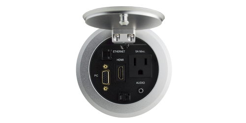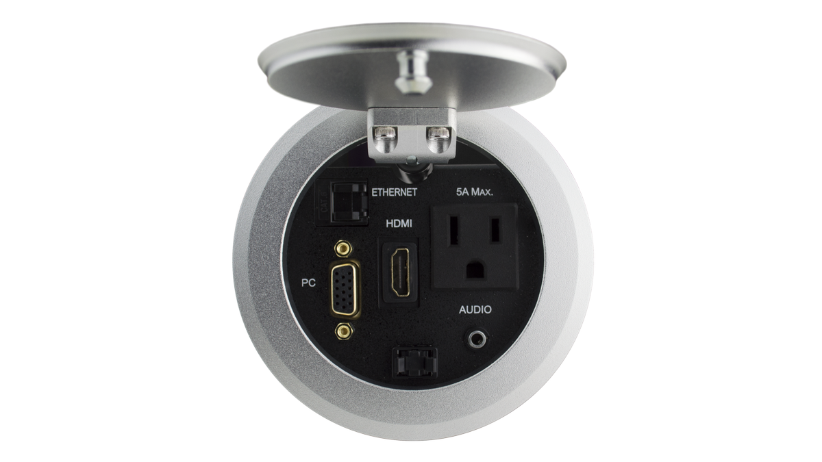 The Liberty TRB-2V1AD-A is a round silver anodized aluminum table box with a pop up lid that hides one power, one HDMI, one VGA, one audio, and one RJ45 connection. Installation is easy since all you have to do is cut a round hole (3.62" to 3.74") and then drop in and secure to the underside of the table with the included clamps. All the connections at the bottom of the box feature female connections so it is easy to plug your male ended cables into, the power cord is 6' long with a 3 prong male end. The box mounts flush in your table and creates an extremely elegant and clean look in any table. When you need access to your connections simply press the top and the lid pops open, when you are done press the lid shut till it latches.