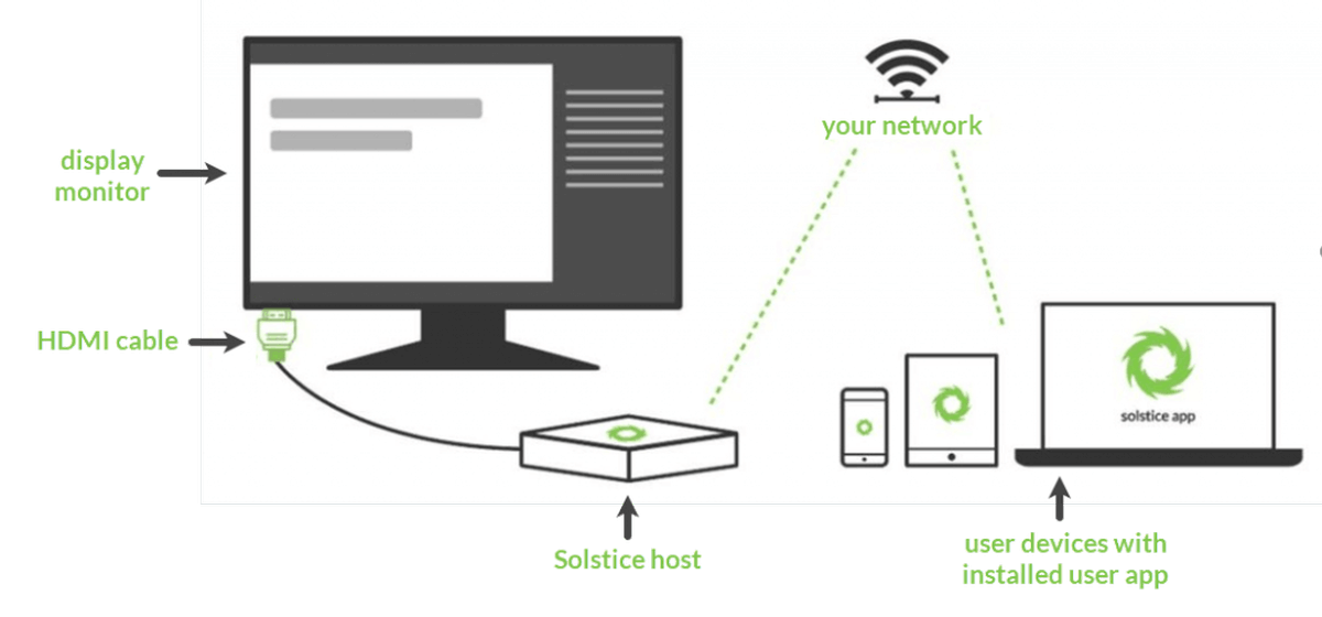 The Solstice Pod connects to any room display via HDMI and attaches to your WiFi/Ethernet network(s). The Solstice Gen3 Pod supports simultaneous HDMI-in and wireless content sharing, dual displays to support a larger content workspace, PoE+, audio out, and USB-C input for future innovation.