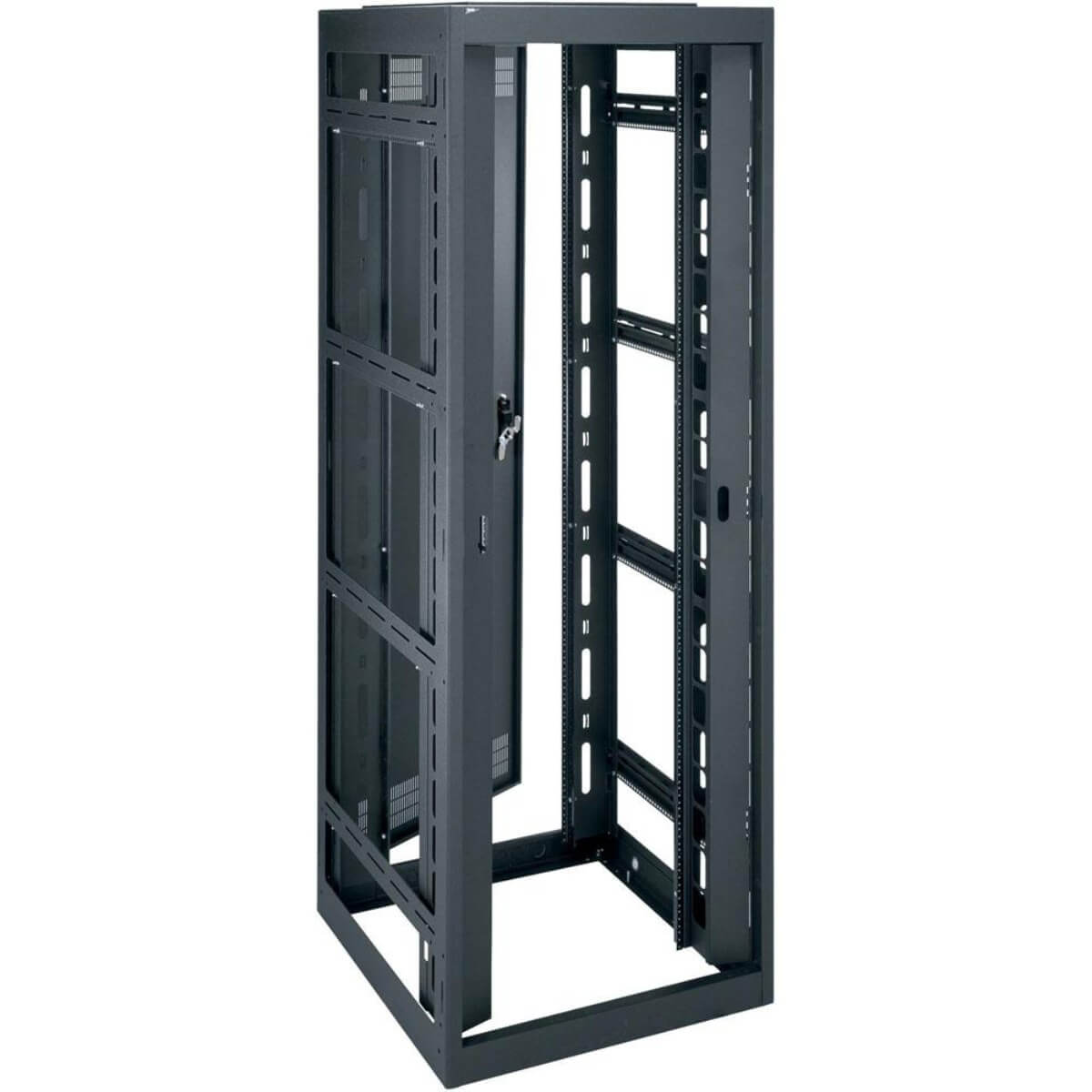 Purpose-built to support high-density cable management, the DRK series rack enclosures has a 30-inch wide footprint for abundant internal cable space and can accommodate 19-inch panel width equipment. Specify a DRK for use in network patching and other cable-heavy applications, and where seismic certification and open or removable sides are required or preferred.