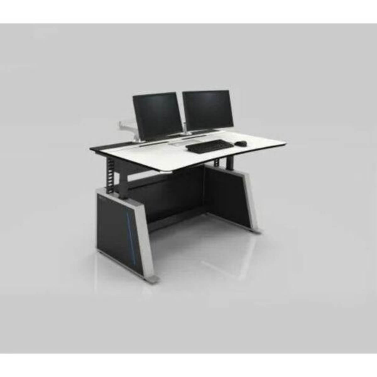 Pre-configured and ready for "quick ship" the LundHalsey Visionline AIR 24/7 control room console is height adjustable for sit/stand applications and is supported by a robust frame providing perfect cable management, integration for active equipment and class leading industrial design. Visionline is also designed to ISO 11064, the international ergonomic standard for control room design. This console is pre-configured and available for "Quick-Ship". Electrically height adjustable from 26" to 47" for Sit/Stand capabilities. Sit/Stand promotes improved:. Physical well-being. Metabolism. Mental stimulation. Concentration. Durable high pressure compact laminate worksurface built to withstand 24/7/365 use. 63"W x 39"D worksurface for 2 operators. Multiple integrated channels running the width and height of the console allows for proper cable management from the floor to the equipment to the operators. Flip up cover on the worksurface for access to multi-purpose compartment. 6RU of rackmount with front and rear access to equipment. Cable pass-thru slots on rear worksurface for monitor cables. Backlit end panels for high aesthetic look. Compatible with LundHalsey Single Monitor Arm (LH-VLAMA). Factory installed corner LED option in worksurface for aesthetics or visual status control. LEDs can be programmed and controlled by control system.