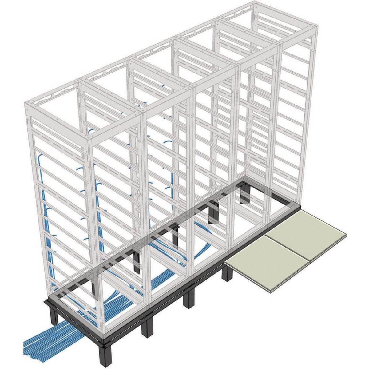 Timesaving and practical, the Raised Floor Enclosure System consists of 2-1/2-inch high riser bases, which provide the ability to perform field rough-in procedures prior to the arrival of the racks and enclosures. Also handy as a lower cable chase for passing cables between racks in multi-bay applications, riser bases feature 1/8-inch thick fully welded construction and an attractive black powder coat finish. Riser bases feature knockouts for passing cables between joined riser bases. Riser feet bring riser bases to a 12-inch height for use with raised floors. Raised floor support angles support floor tiles when used with riser bases and feet. Custom width, depth and height RIB Series riser bases are also available,