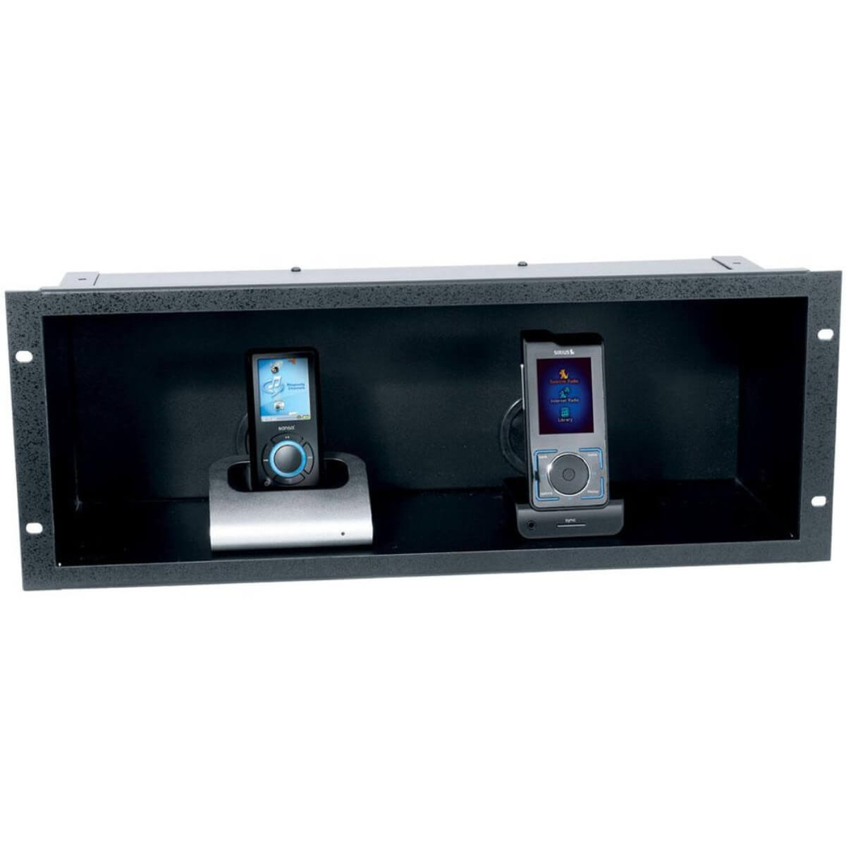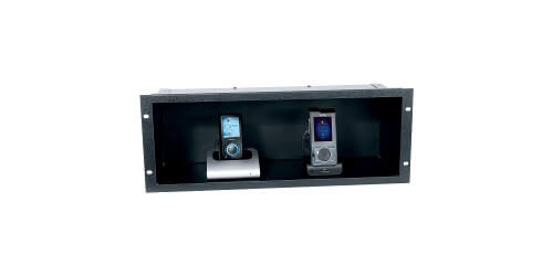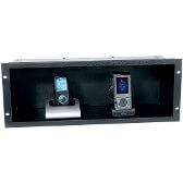 This is a convenient method for rackmounting portable media players and docks. This versatile shelf can accommodate most MP3 players and satellite radio receivers and can hold one or more players. Grommets in the rear of the rackshelf protect cords and ease cable management. An available accessory shelf can attach to the rear of the SH-DMP for the mounting of third party devices and enhance cable management.