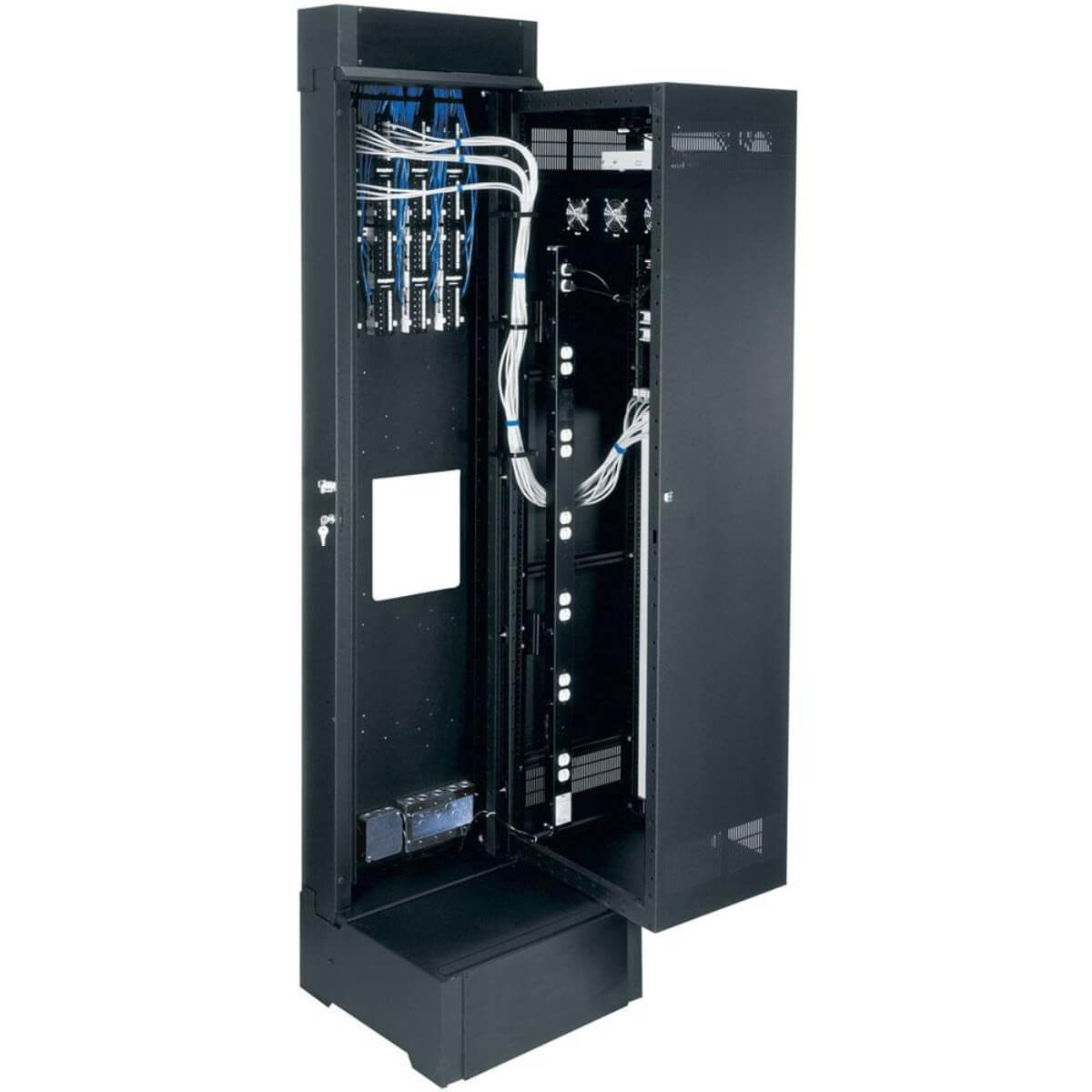 - Flexible cable entry access at the top, bottom and sides of the rack with additional knockouts for electrical box and fans