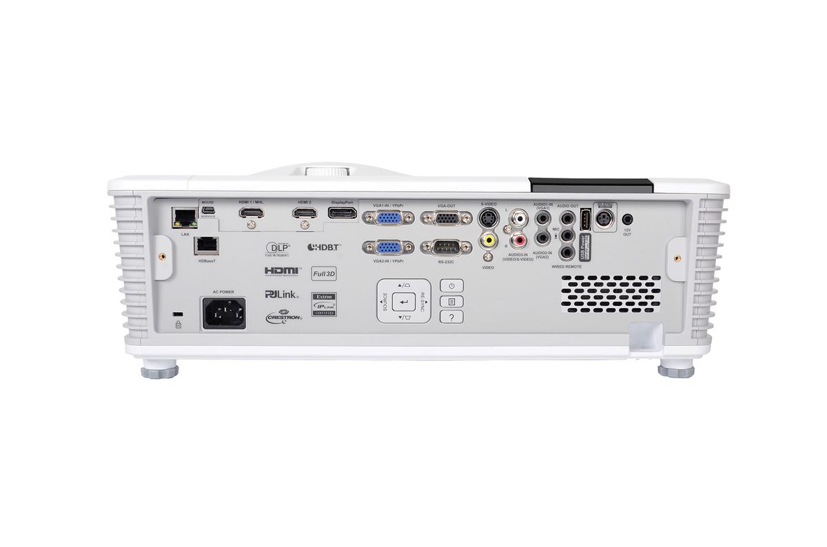 - I/O Connectors: 1x HDBaseT, 1x Display port, 2x HDMI 1.4a + MHL, 2x VGA-In, 1x VGA out, Composite Video, S-Video, 3x Audio-In (stereo, 3.5mm and RCA), 1x Audio-Out (3.5mm jack), 1x Mic in (3.5mm jack), 12v trigger, USB type-A 5V, 3D Sync vesa port, RS-232C, mini-USB (service/control), RJ45, AC power (3 pin)