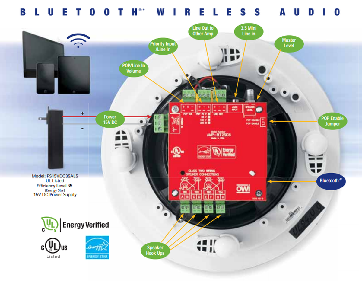 • One (1) each (AMP-BT2SIC6) 6.5" amplified speaker with (PS15VDC35AL5) 15 volts Level 5 power supply