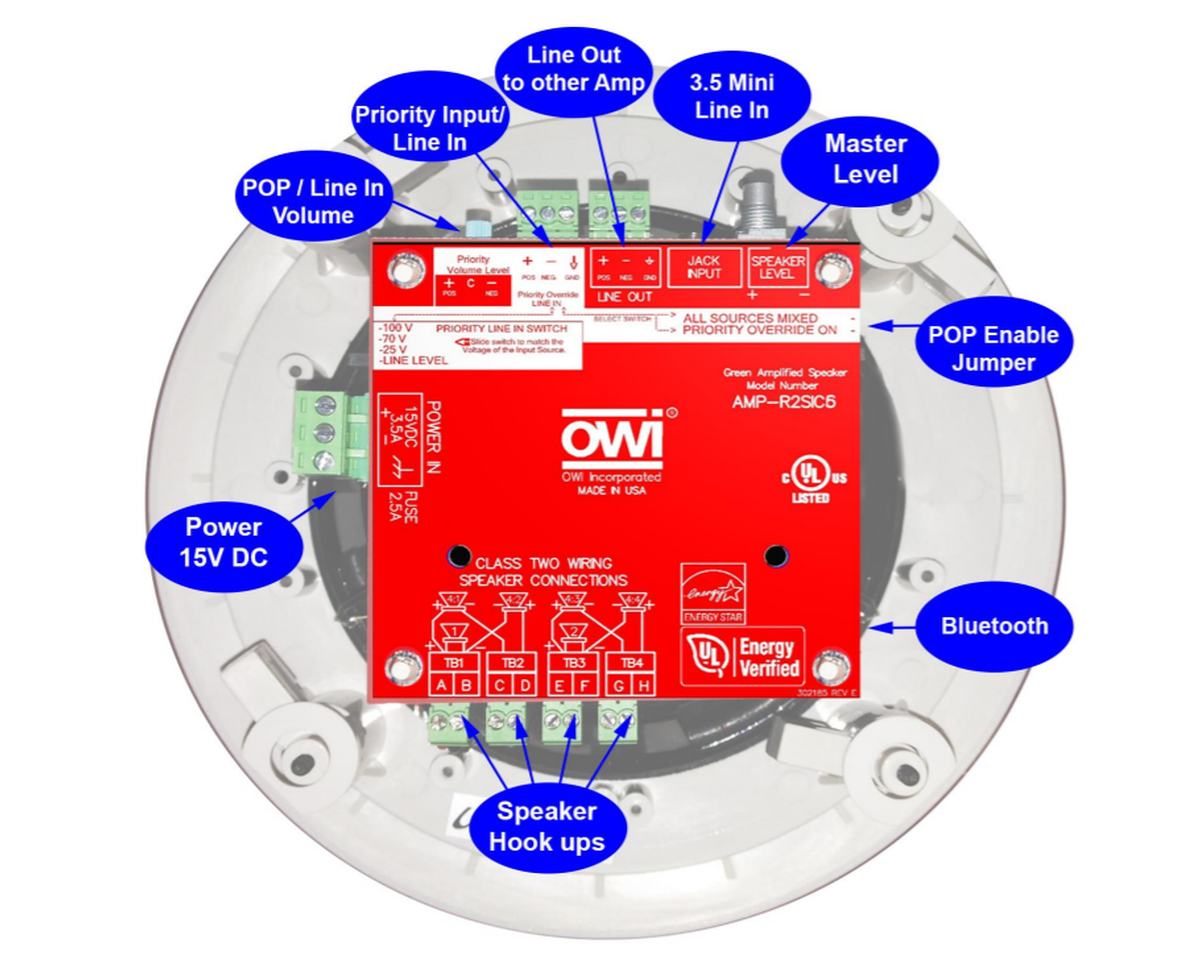 The OWI AMP-BT2SIC62SVC is a two source, 6.5" Amplified Drop Ceiling Speaker with Bluetooth, and volume controller, two speaker package. These speakers deliver up to 40 watts power directly to the speaker, with each powered speaker being able to drive three additional speakers. One line can drive up to 10 self-amplified speakers that boast a lower noise feature and protection from shorts and overheating. These speakers are UL Listed, have 2 line level input/sources, a priority override feature, built-in stereo combiner, balanced line level output, and provide a fast and easy in the field install. Your projector, laptop, DVD, or MP3 player gets connected to the volume control, the knob will then offer complete control over your room audio. Buy multiple kits if you need multiple sources with their own audio control.