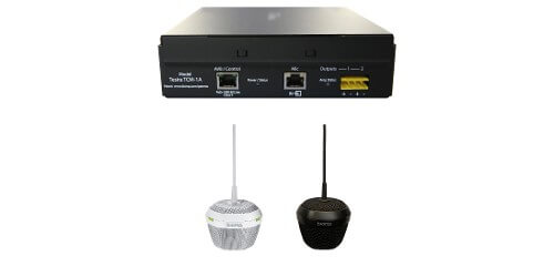 The Parlé TCM-1A is an AVB ceiling microphone and PoE+ amplifier comprised of a pendant microphone and plenum box. Each microphone includes Beamtracking technology with three 120-degree zones, providing full 360-degree coverage of the meeting space. The plenum box is equipped with an additional RJ-45 connector for daisy-chain connections; a maximum of three microphones are permitted per daisy chain (one TCM-1 or TCM-1A required, plus up to two TCM-1EX). The 2-channel PoE+ amplifier includes an internal limiter, selectable power, and a burst mode to handle peak signals.