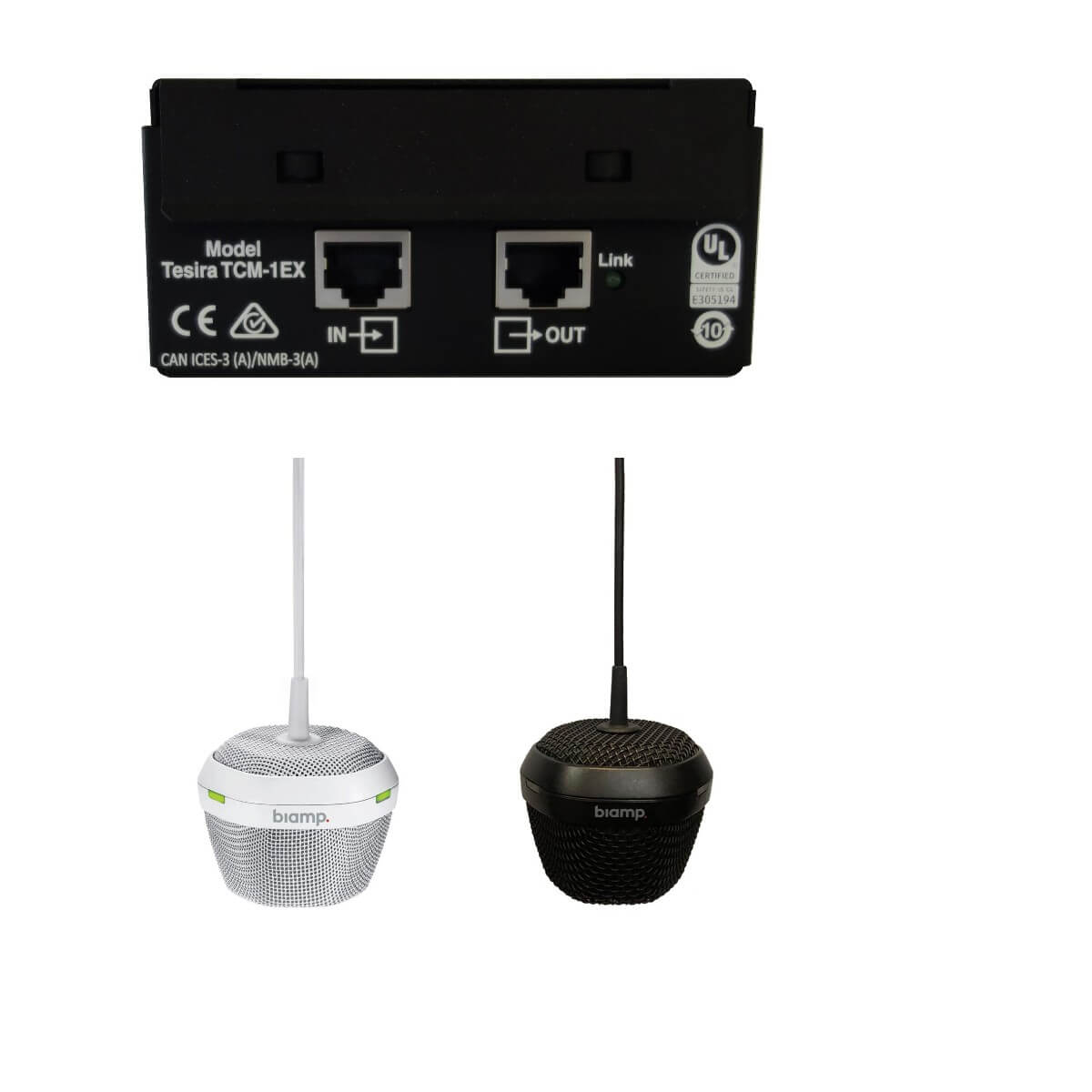 The Parlé TCM-1EX is an expansion AVB ceiling microphone intended to be used as a second and third microphone in conjunction with a TCM-1 or TCM-1A; it cannot operate as a standalone device. Each microphone includes Beamtracking technology with three 120-degree zones, providing full 360-degree coverage of the meeting space. The plenum box is equipped with an additional RJ-45 connector for daisy-chain connections; a maximum of three microphones are permitted per daisy chain (one TCM-1 or TCM-1A required, plus up to two TCM-1EX).