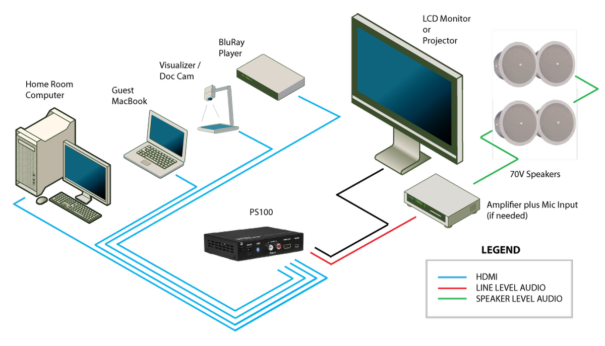 The PS100 is HDCP compliant, can output 4K2K resolution, selectable EDID, and includes brackets to mount under the table for simple installation. If the sound coming from your projector or flat panel is lacking the PS100 has audio out that can be connected to your conference rooms audio system.