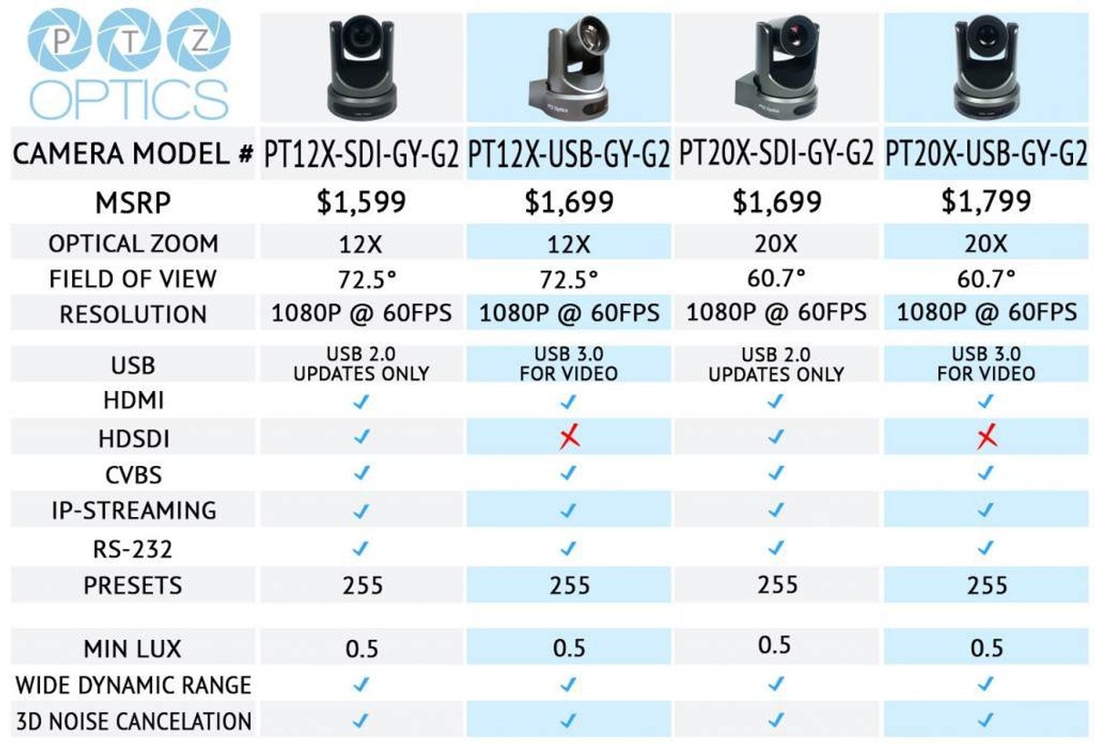 The PTZ Optics PT12X-USB-GY-G2 is a professional grade camera that delivers pristine image quality and numerous control options with integrated H.264 IP streaming.