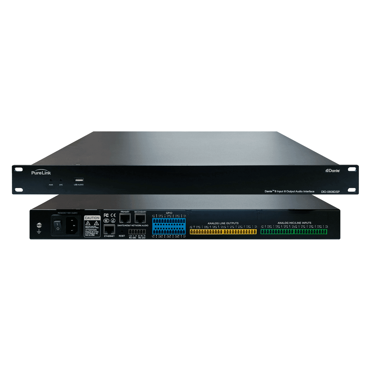 The DIO-0808DSP provides eight (8) balanced/unbalanced stereo analog inputs, eight (8) balanced/unbalanced stereo analog outputs, and includes a full suite of DSP functions.