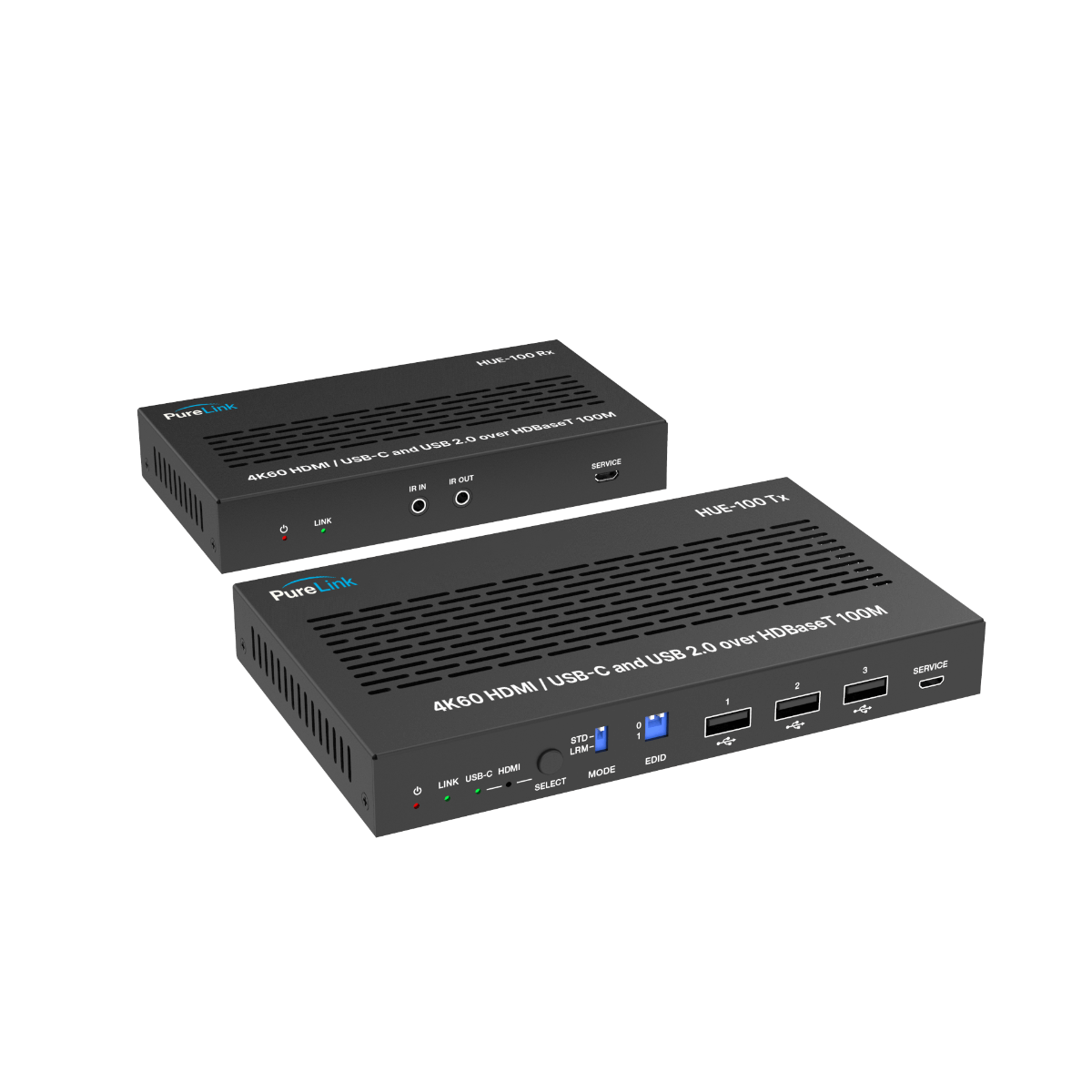 The HUE-100 HDMI and USB-C HDBaseT 3.0 extension system offers full HDMI 2.0b, HDR/HDR10/HDR10+ (High Dynamic Range) 4K@60Hz 4:4:4 up to 100 meters on CAT6a/7 cable . The HUE-100 can also transport 1080P60 8 bit up to 150 meters over CAT6a/7 cable. Manual or automatic selection of HDMI and USB-C inputs is available on front panel controls and API. User defined EDID and extraction of display EDID are easy operations using the HUE-100 simple API.