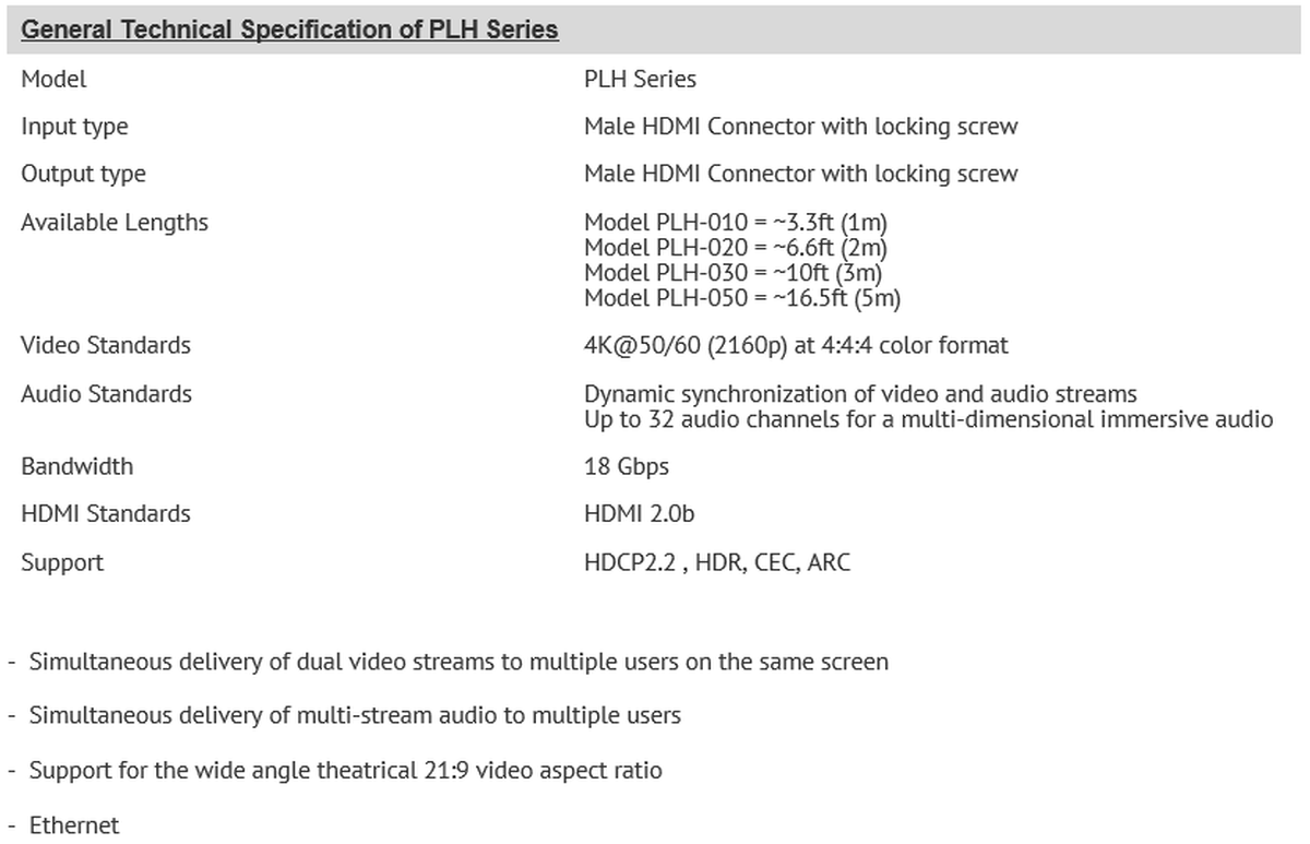 The PLH Cable series was engineered to meet all your Audio and Video needs. Being able to Dynamically Sync video and audio streams, with up to 32 audio channels giving the user a true multi-dimensional immersive audio experience. While also simultaneously delivering dual video and audio streams to multiple users on the same screen. Also featured is wide angle theatrical 21:9 video aspect ratio support. Comes backed by PureLink's 3 year warranty.