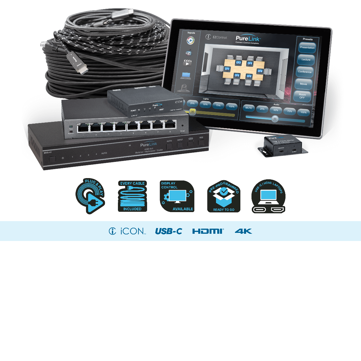 - Fully Pre-Programmed Meeting Room Solution, includes: