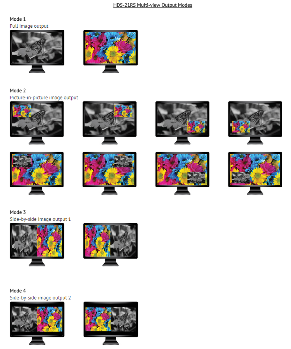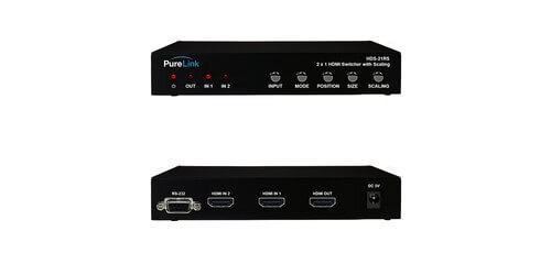 The PureLink HDS-21RS is a 2 input and 1 output HDMI auto switcher that can auto scale resolutions up to 1080p at 60Hz. The switcher can be controlled via the front panel buttons, RS-232, or with the included IR remote control. Another feature is that it provides auto switching, it will detect the last plugged in signal and automatically switch. The switching is extremely fast and seamless, perfect for presentations. A unique feature at this price point is an integrated multiviewer, offering picture on picture and split screen capabilities. The switcher is HDCP compliant and is ideal for conference rooms and home theater settings.