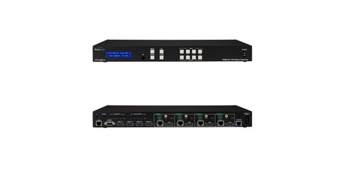The PureLink HTX-4400-U is a 4x4 HDMI 4K matrix switcher, it features 4 HDMI inputs and either 4 HDMI outputs or 4 HDBaseT outputs. The outputs can also be mirrored for a total of 8 outputs. The HDBaseT outputs feature 5-play technology and can send your video with embedded audio, LAN, RS-232, dual IR, and PoE up to 328'. Having Power over Ethernet means that your receivers do not require power so they don't have to be placed near a power outlet. Since the matrix is compliant with HDCP 2.2 that means that you don't have to worry about any handshake issues between your devices. Extensive EDID management is available to ensure that your monitors are getting the correct resolution needed.