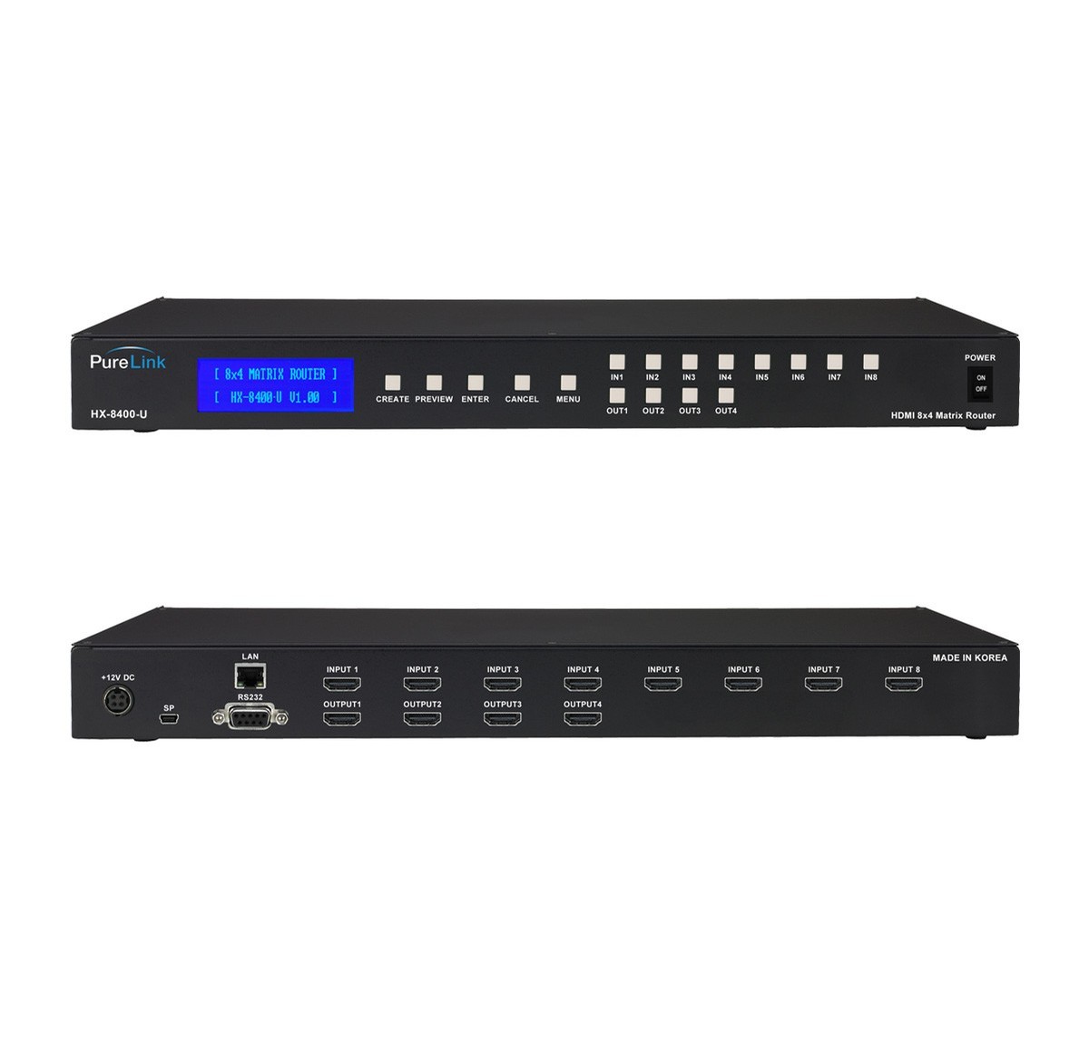 The PureLink HX-8400-U is a 8 HDMI input and 4 HDMI output matrix switcher. It supports resolutions up to 4K and HDMI version 1.4b, Installation is made easy with PureLink's advanced HDCP and EDID management. An LCD screen on the front makes viewing your systems current status easy, while the easy to use buttons on the front allow for local control. The matrix can also be controlled via RS-232 or IP.