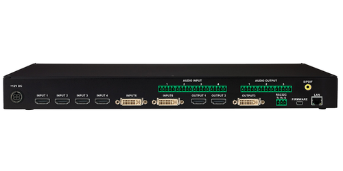 Also integrated is a 4x3 balanced/unbalanced audio matrix router, the 4 inputs can be mixed with any video source to produce a new HDMI output with embedded audio. There are 3 individual audio outs and one S/PDIF that can be used to to be sent to an external source.