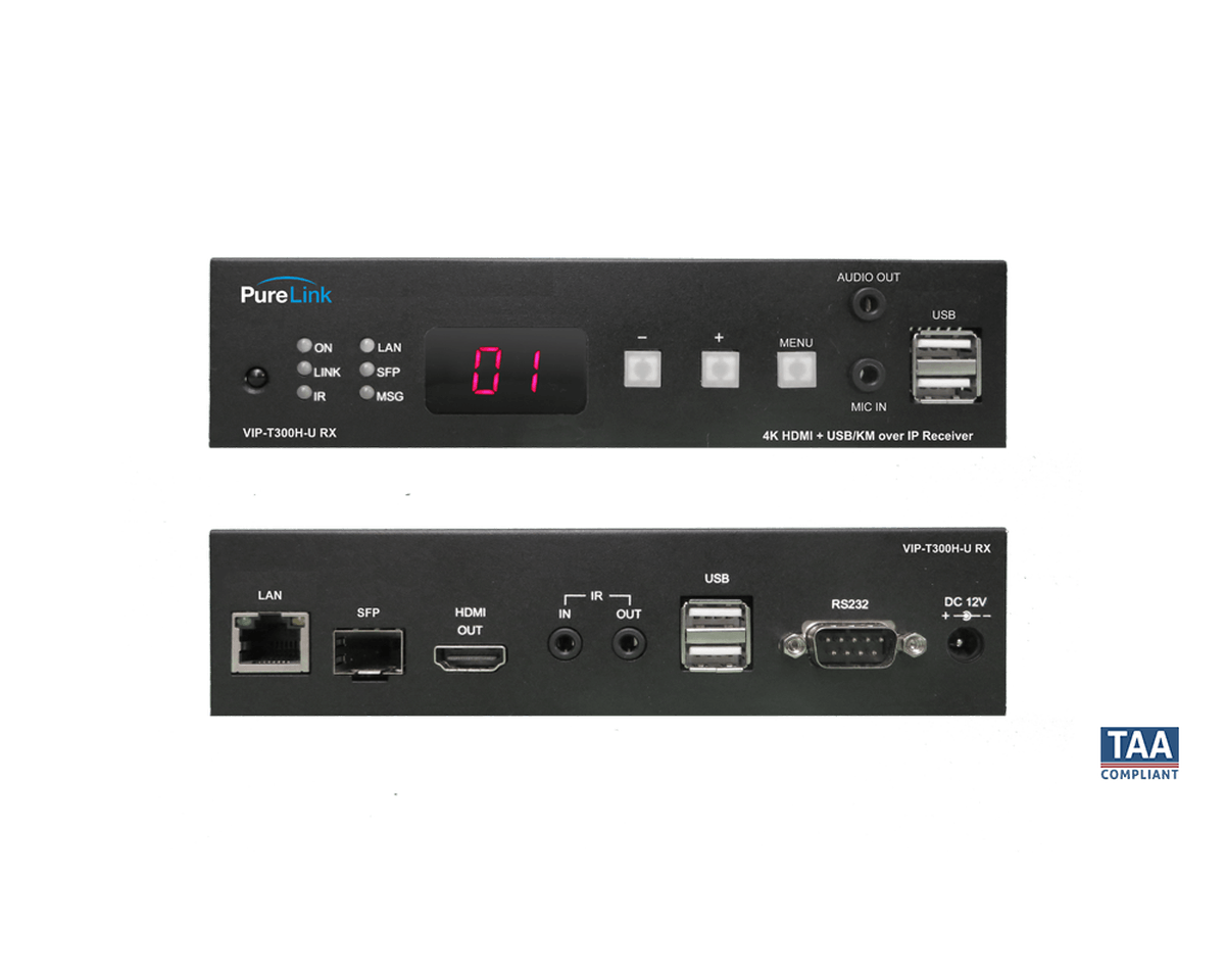 The PureLink VIP-T300H-U 4K HDMI & USB/KM over IP Distribution System provides UltraHD/4K video, audio, RS-232, IR, and USB signal transport over IP networks. The VIP-T300H-U can be used as a point-to-point extension system supporting distances up to 300 meters, as well as layered distribution, switching, and matrix switching systems using multiple control options including PureLink’s VPX IP Video Management Software.