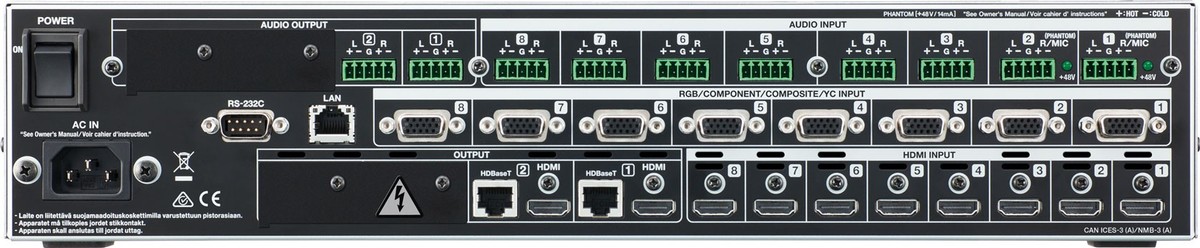 The Roland XS-82H can handle both your digital and analog needs, choose any combination of 8 HDMI or 8 VGA inputs. You can then output these via HDMI or the HDBaseT outputs, the HDBaseT can send your video, audio, and RS-232 up to 328' over Cat5e/6 cabling. Each input can individually be scaled to your choice of resolution, each output can be in your chosen format. Not only can you control the matrix via the iPad app but also RS-232, and the front panel. The front control panel allows for complete control and the large LCD screen shows exactly that is happening with your distribution.