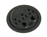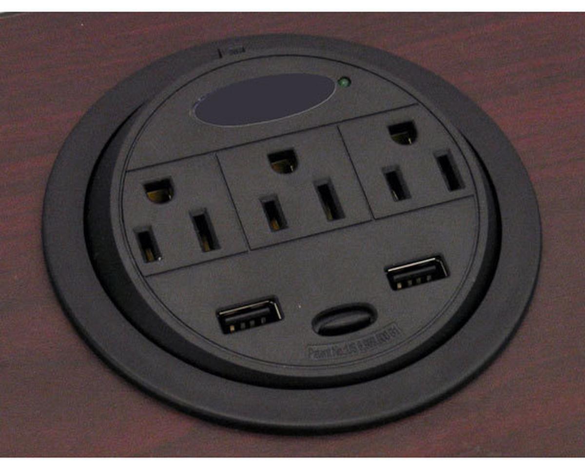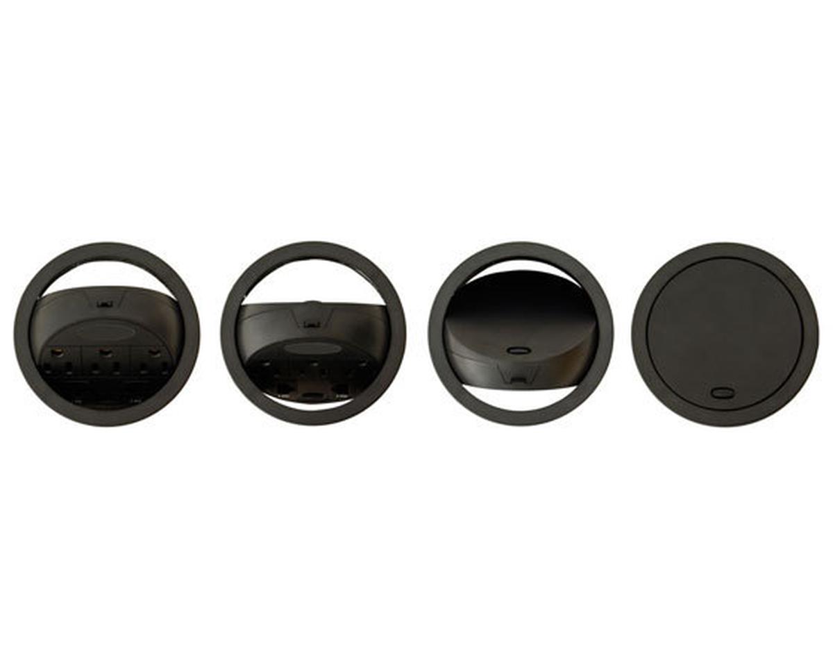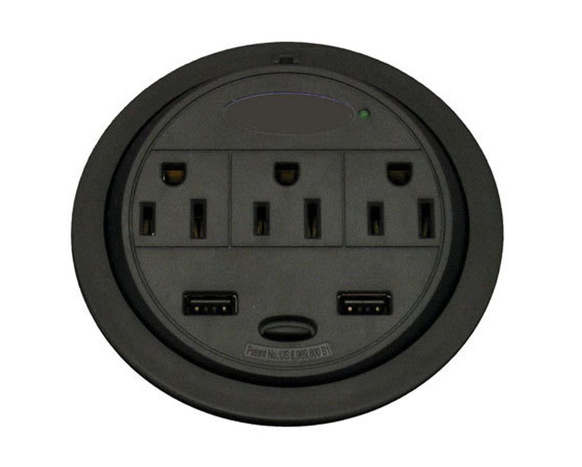 The Stratis PowerTap GMPT-3B is a grommet that installs easily in a table surface, the grommet includes 3 AC power outlets and 2 USB charging ports. Coming out of the back of the unit is a single 8' power cord. The GMPT-3B is unique in that it installs flush and concealed with your table when not in use, when needed simply slide the latch and push and rotate and it flips around exposing your connections.
