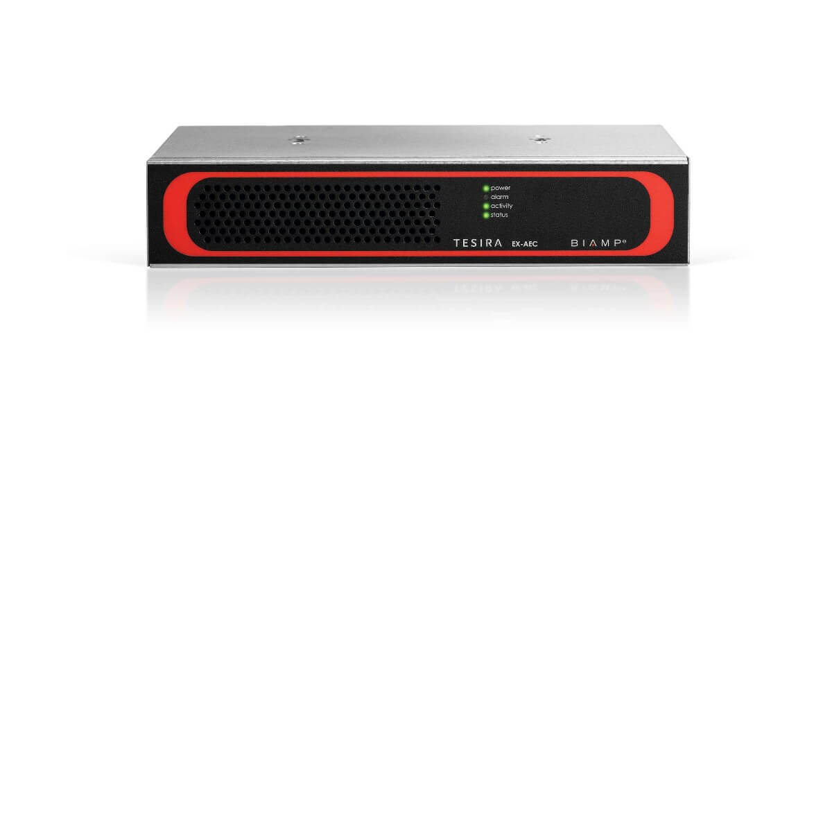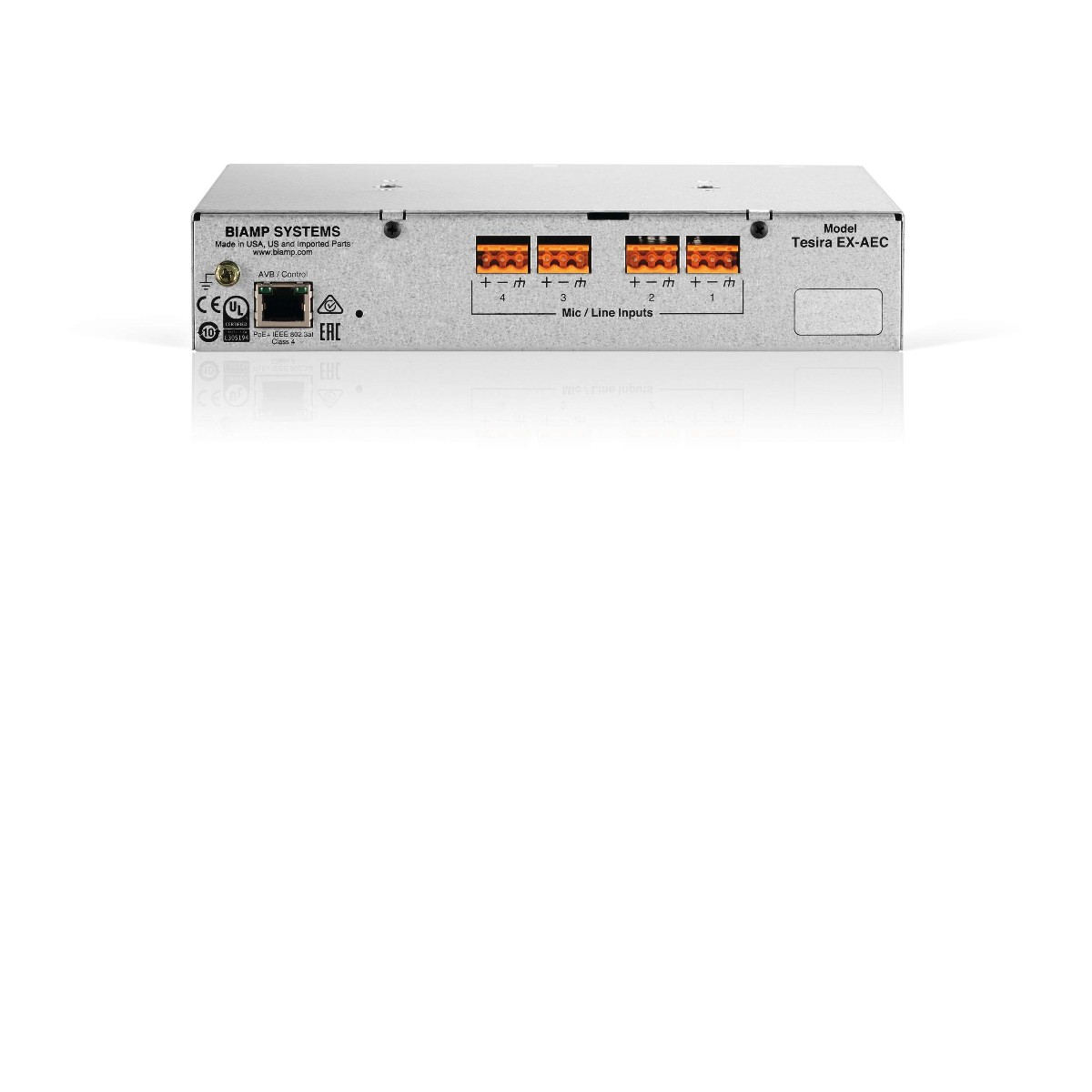 The Tesira EX-AEC is a half-rack expander box for use with AVB-enabled Tesira server-class devices. The EX-AEC is a 4-channel mic or line level audio input expander with AEC (Acoustic Echo Cancellation). The expander communicates with the Tesira AVB network for audio networking, configuration, and control, and is powered by PoE+.