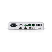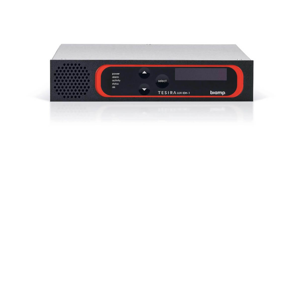 The TesiraLUX IDH-1 is an AVB/TSN enabled video encoder capable of transmitting video signals up to and including 4K60. The IDH-1 functions as a video server-class device in a Tesira media system and is configured through the Tesira configuration software. Acting as an AVB talker, the IDH-1 fully integrates digital audio and video on a single network, allowing for simplified lip sync management and end-to-end network transit latencies of less than 1.5 frames. Multiple software-based options are available for managing bandwidth, including setting maximum resolution, frame rate floor, and/or a rate of compression. The AVB/TSN streams can be transmitted over 1Gb or 10Gb ports while control signals are managed via a separate 1Gb Ethernet port. The IDH-1 accepts 8 channels of PCM audio for embedding/de-embedding, and includes 2 mic/line level analog inputs. The TesiraLUX IDH-1 can be used as a standalone device (paired with a TesiraLUX OH-1) or can be combined with other Tesira servers, expanders, endpoints, and controllers.