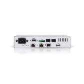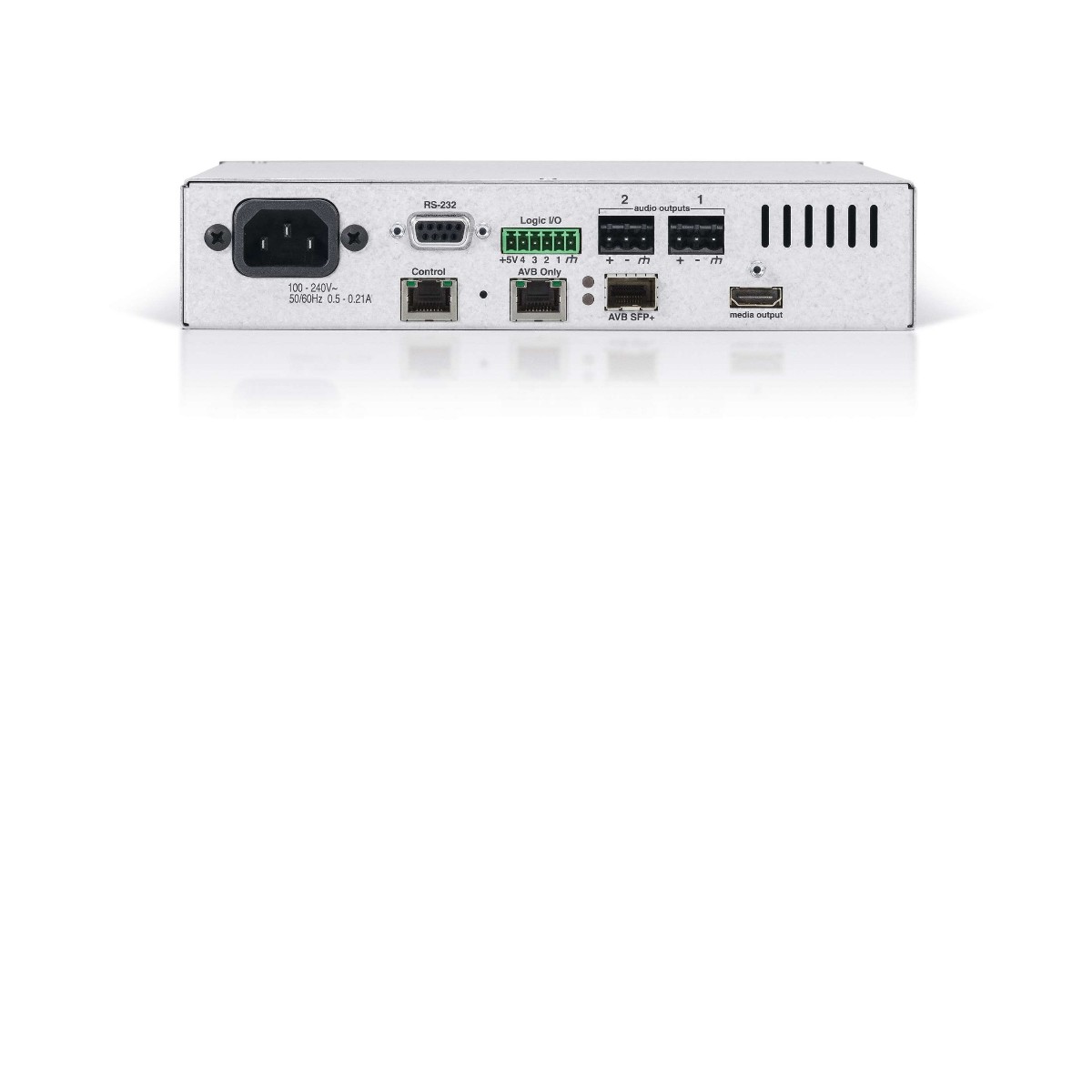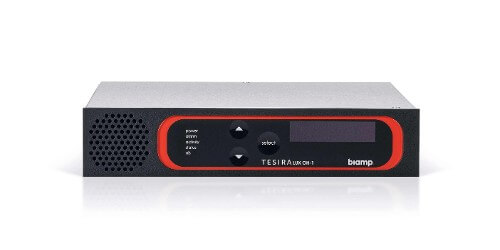 The TesiraLUX OH-1 is an AVB/TSN enabled video decoder capable of outputting video signals up to and including 4K60. The OH-1 functions as a video server-class device in a Tesira media system and is configured through the Tesira configuration software. Acting as an AVB listener, the OH-1 fully integrates digital audio and video on a single network, allowing for simplified lip sync management and end-to-end network transit latencies of less than 1.5 frames. The AVB/TSN streams can be received over 1Gb or 10Gb ports while control signals are managed via a separate 1Gb Ethernet port. The OH-1 accepts 8 channels of PCM audio for embedding/de-embedding, and includes 2 mic/line level analog outputs. The TesiraLUX OH-1 can be used as a standalone device (paired with a TesiraLUX IDH-1) or can be combined with other Tesira servers, expanders, endpoints, and controllers.
